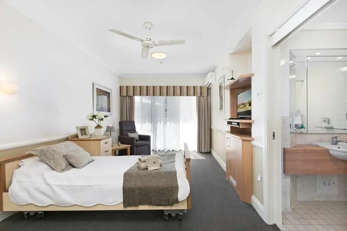 Our Superior Single Room Accommodation is spacious, comfortable, and tastefully decorated, and feature a private ensuite. Inclusions: automated king-single bed, armchair, overbed table, reverse-cycle air conditioning, ceiling fan, ample storage, large TV, mini-fridge, emergency call system.