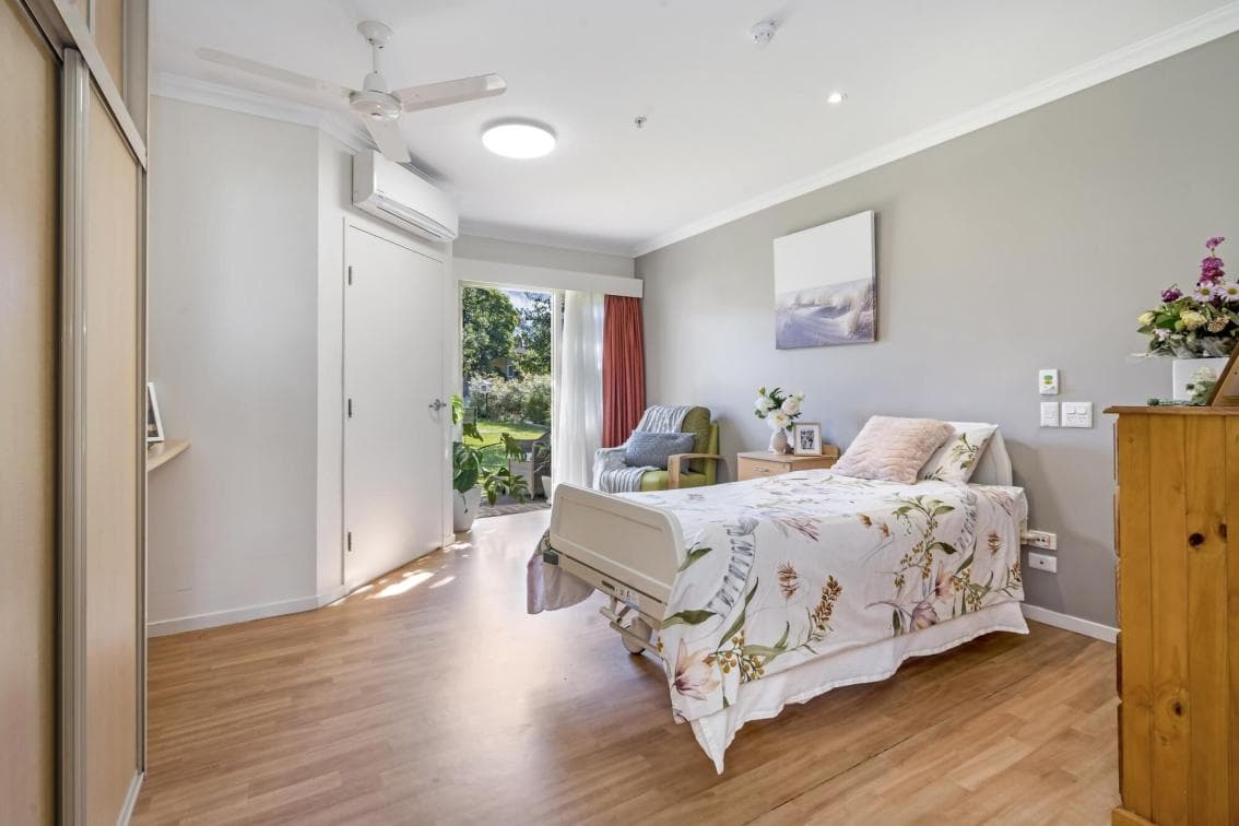 Make yourself at home in this generous 11 sqm private room with shared ensuite. This room features quality furnishings including an adjustable bed, table and chairs, a wardrobe and drawers for storage and soft furnishings including curtains, blinds and bedding. The bathroom consists of a toilet, wash basin, shower, vanity cabinet and mirror. Residential amenities include an easy-to-use 24 hour nurse call system.