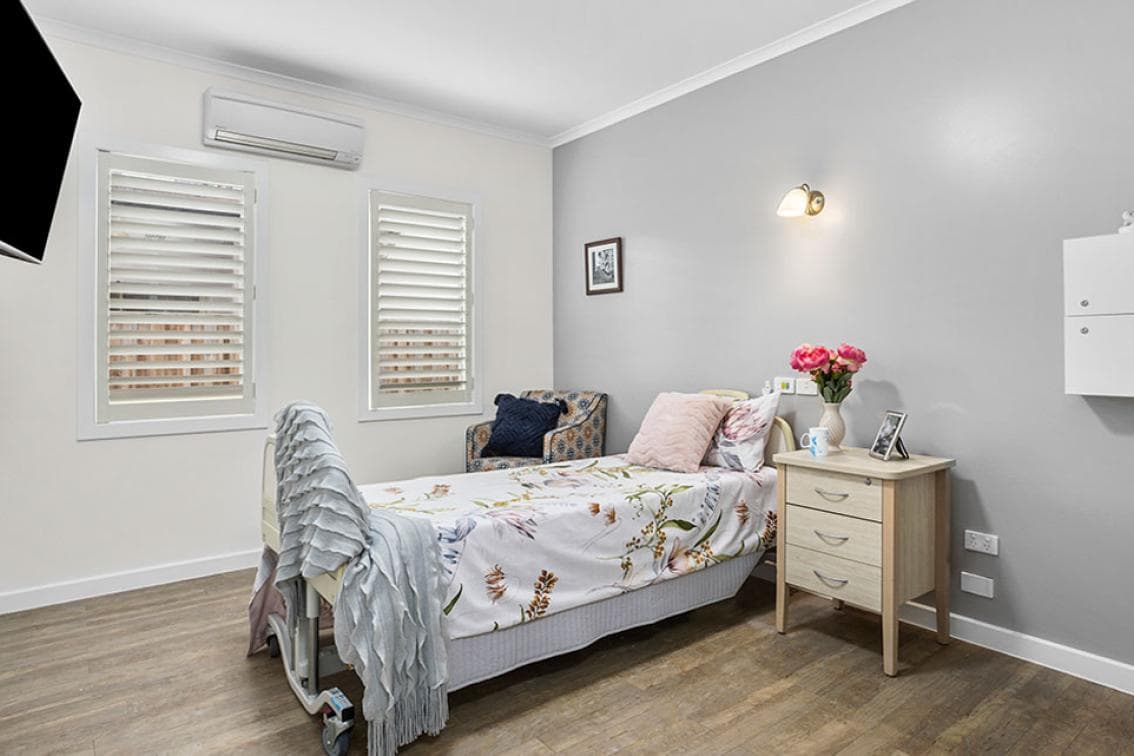 This modern 15 sqm room with private ensuite boasts attractive leafy views and air conditioning. High quality furnishings include an adjustable bed, chair, an over-the-bed table and a wardrobe and drawers for storage. Quality soft furnishings include curtains and bedding and the ensuite bathroom consists of a toilet, wash basin, shower and mirror. Residential amenities include an easy-to-use 24 hour nurse call system.