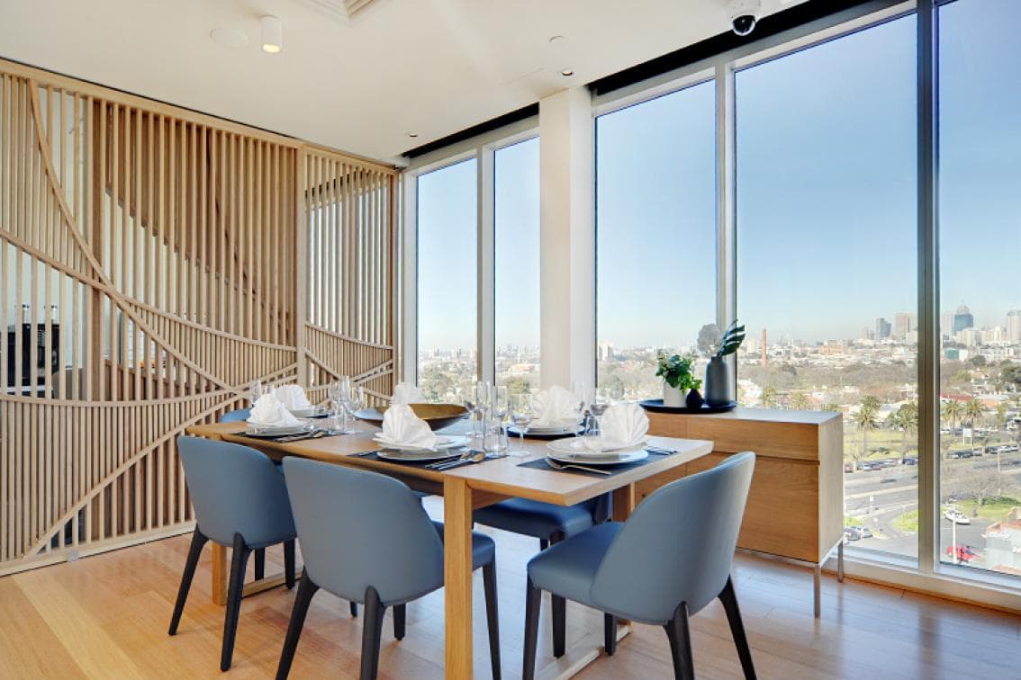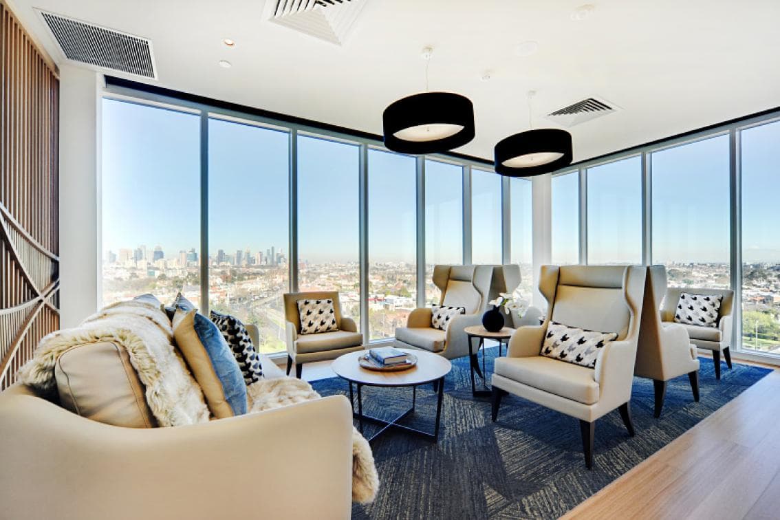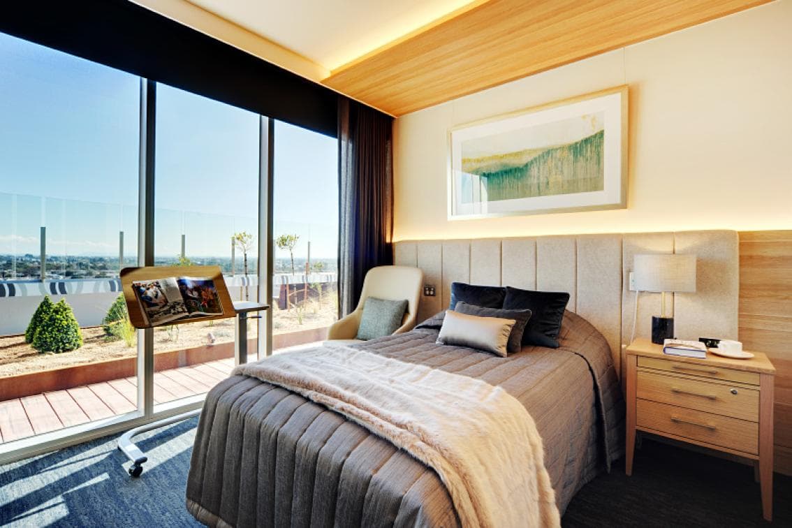 Our penthouses are our premium offering for the discerning resident who is looking for privacy and exclusivity. With the largest floor plans , prime locations, and spectacular views of the surrounding suburbs, our penthouses set the standard for aged care accommodation in Melbourne. Penthouses feature dual picture or floor-to-ceiling windows that fill the space with natural light, a built-in refrigerator, wardrobe and desk, luxury bedspreads and cushions, and a spacious modern bathroom with an easy access shower and toilet.All rooms incorporate the latest features to ensure your safety and comfort including a wall-mounted flat-screen television, telephone connections (service fees may apply), emergency call buttons, height-adjustable king single beds, and bedside tables. For your peace of mind, TLC Aged Care Fitzroy North is secured by a state-of-the-art security system, and CCTV monitors all common areas.