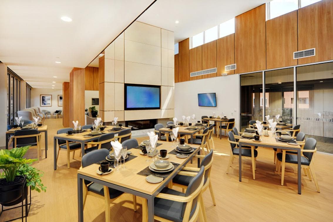 Our classic rooms feature large bay windows that fill the space with natural light, a built-in wardrobe and desk with provision for a refrigerator, luxury bedspreads and cushions, and a spacious modern bathroom with an easy access shower and toilet. All rooms incorporate the latest features to ensure your safety and comfort including a wall-mounted flat-screen television, telephone connections (service fees may apply), emergency call buttons, height-adjustable beds, and bedside tables. The in-room sensory flooring system will alert staff the instant you require assistance. For your peace of mind, TLC Aged Care Armstrong Creek is secured by a state-of-the-art security system, and CCTV monitors all common areas.