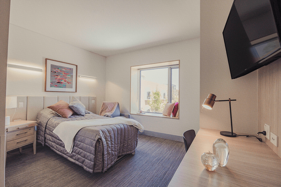 Our deluxe rooms offer the best available outlooks and are conveniently located close to living, lounge, and dining areas. Deluxe rooms feature large bay windows that fill the interior with warm natural light, a built-in wardrobe and desk with provision for a refrigerator, luxury bedspreads and cushions, and a spacious modern bathroom with an easy access shower and toilet. All rooms incorporate the latest features to ensure your safety and comfort including a wall-mounted flat-screen television, telephone connections (service fees may apply), emergency call buttons, height-adjustable beds, and bedside tables. The in-room sensory flooring system will alert staff the instant you require assistance. For your peace of mind, TLC Aged Care Armstrong Creek is secured by a state-of-the-art security system, and CCTV monitors all common areas.