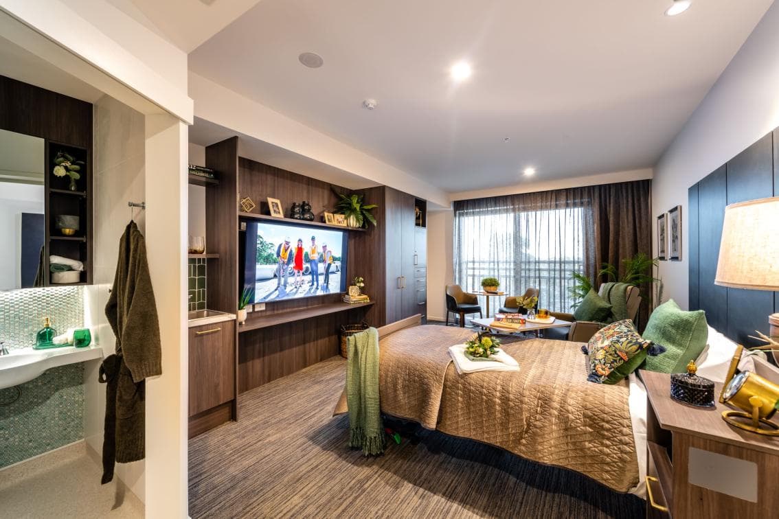 Suites are larger than average sized rooms and include oak wood cabinetry ; 65" smart TV ; Writing/ craft desk; electric recliner; writing/tub chair; coffee table; bedside table; overbed table; big button telephone with two way calls; private ensuite with Japanese style bidet; kitchenette with sink, hot/cold water facilities and power points for a kettle*; adjustable king single bed; multiple nurse call buttons; lighting control panel (conveniently beside the bed); entertaining lounge; wardrobe with lockable area . All rooms are in close proximity to shared designer lounges, servery areas and communal kitchen areas for resident and family use . *not available in Memory support unit