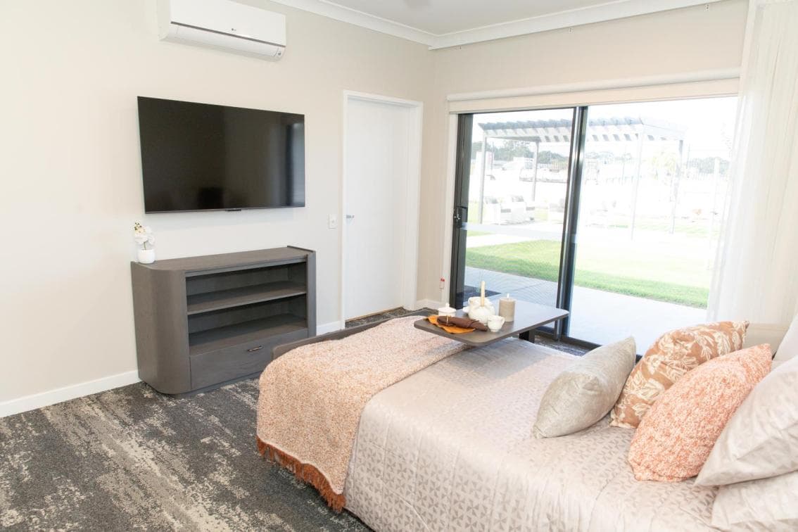 A good-sized single room with private tiled ensuite plus the following features: external access to a patio, in-built robes, smart 50” wall-mounted TV, additional under TV storage, private tiled ensuite, fully electric king single bed with hand & foot (5 function) controller including Trendelenburg functions with a pressure relieving mattress, blinds and sheers, air-conditioning with individual room temperature control.