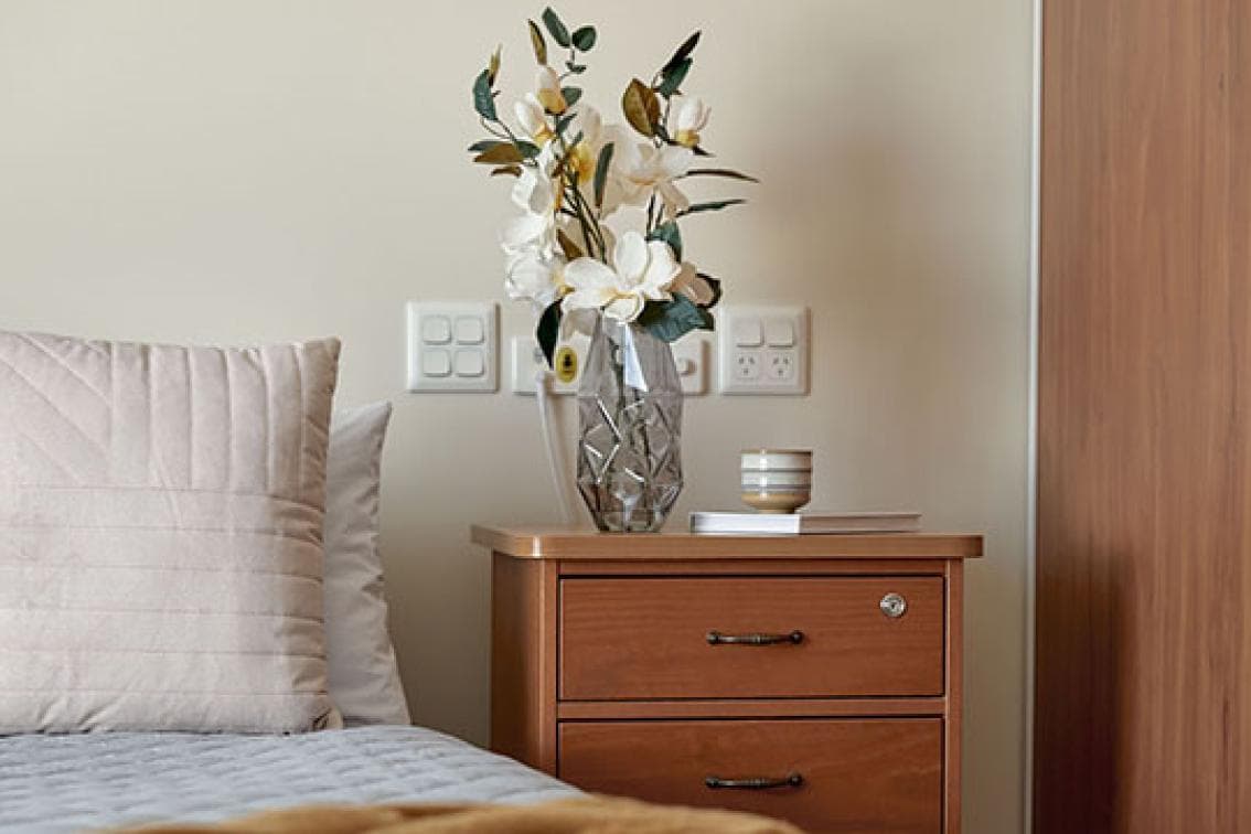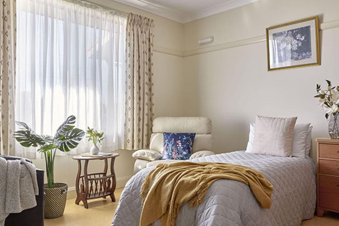 Our Comfort Living Room at Uniting Elizabeth Gates & Alroy House Singleton has been designed for privacy. The room offers home comforts including a bed, bedside table, traditional furnishings and fittings, personal storage and a private ensuite. All of these rooms are in good condition and are well lit.