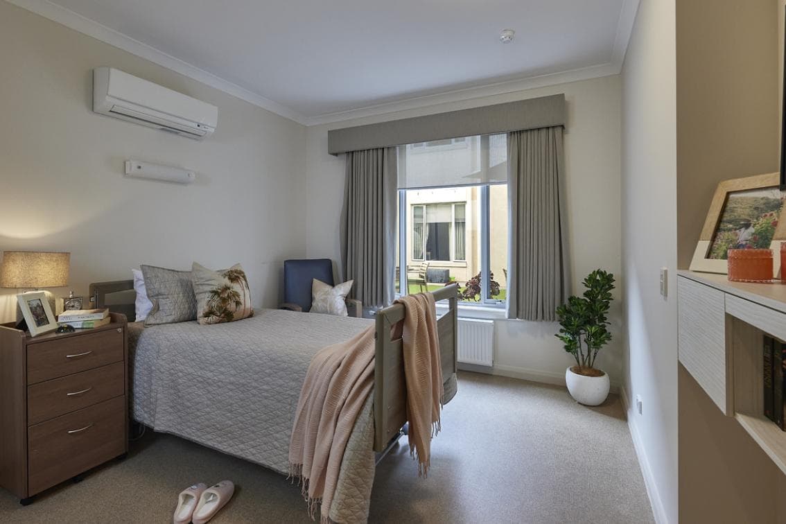 "Modern single bedroom with private ensuite bathroom. Our rooms are designed for comfort with appropriate personal storage and furniture that is designed for Aged Care needs."
