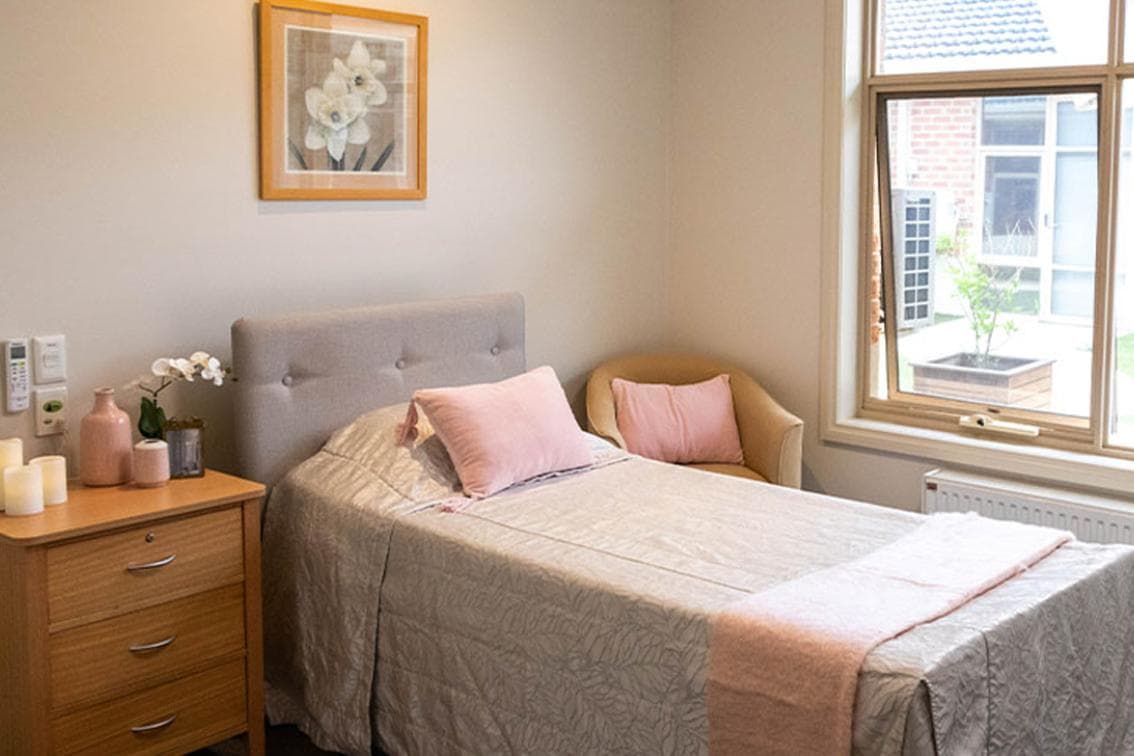 Modern single bedroom with private ensuite bathroom. Our rooms are designed for comfort with appropriate personal storage and furniture that is designed for Aged Care needs.