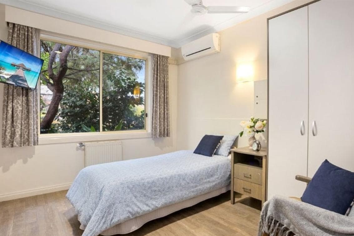 This bright, private 12 sqm room overlooks our beautiful courtyard, giving you peaceful views, natural light and a welcoming place to call home. This room features high quality furnishings, including an adjustable bed, chair, an over-the-bed table and storage of a wardrobe and drawers. High quality soft furnishings include curtains and bedding. The bathroom is a shared ensuite and consists of a toilet, wash basin, shower and mirror. Residential amenities include an easy-to-use 24 hours a day nurse call system.