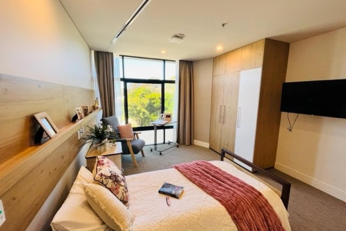 Spacious, modern private room with an ensuite and garden views. Low maintenance living with built-in hotel services including laundry and meal services. Tastefully designed room includes a comfortable electric bed, bedside table with a secure lockable drawer, chair, telephone, TV connections and a built-in wardrobe. Nicely-appointed room with high quality fittings and fixtures and air-conditioning for additional comfort.