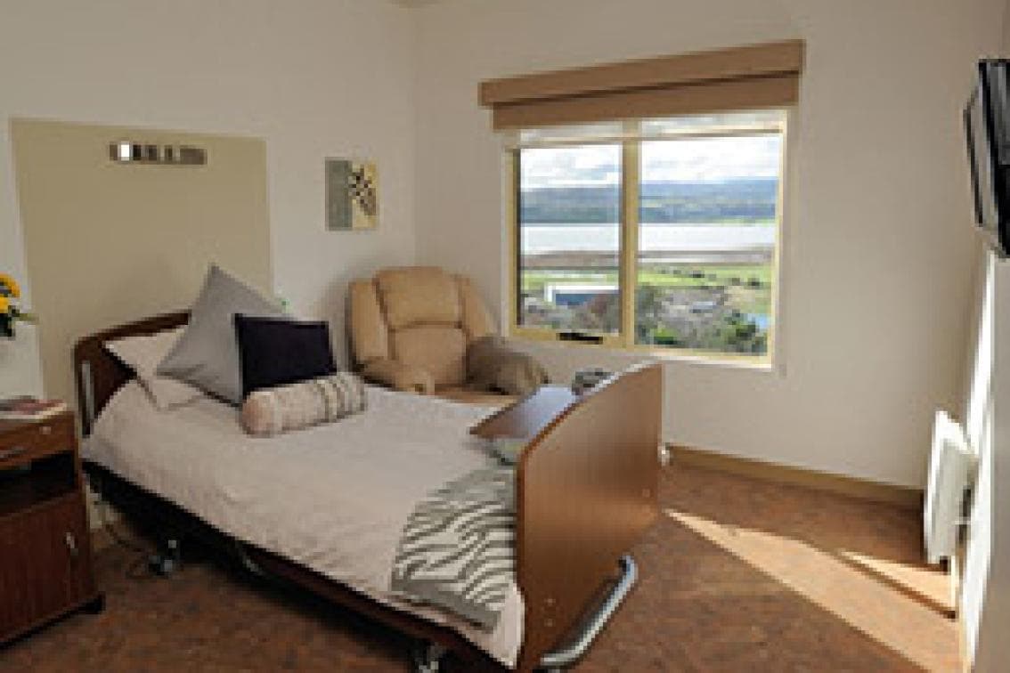 Rooms have view of river and mountains and are well maintained with vertical window blinds and co-ordinated pelmets,flyscreens and carpet. Furniture is of a high quality with electric adjustable beds, bedside cabinet, overbed table, wall shelving, built-in wardrobe with lockable storage, chair, overbed light, flatscreen TV,bedding is of high quality with pressure relieving matress, nurse call point, wall heater. In ceiling resident hoist mechanism, privacy screens.