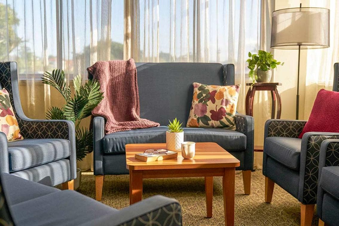 Our Spacious Living Room at Uniting Thomas Roseby Lodge Marrickville has been designed for privacy. The room offers home comforts including a bed, bedside table, traditional furnishings and fittings, personal storage and a private ensuite. All of these rooms are in original condition and are well lit.