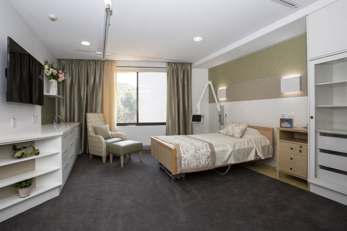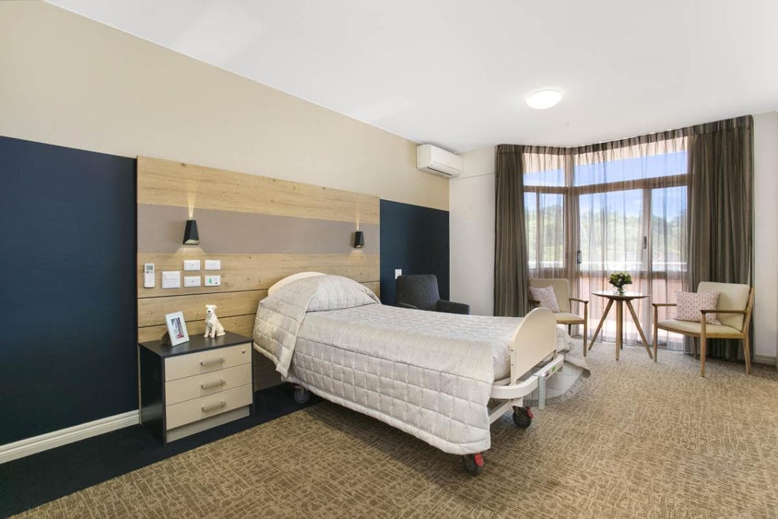 The rooms have been decorated with neutral colours to encapsulate the surrounding bushland vistas that ensures that each room provides a tranquil retreat for our residents. Floor to ceiling windows allows for unobstructed views and have been furnished with block out curtains to provide additional privacy. The ensuites have large accessible bathing and toileting areas, tiled from floor to ceiling. Ample storage for toiletries is provided in the built in vanity unitsTo create additional "at home" comfort, the rooms have been fitted with high quality cabinetry that features an under-bench sink and concealed refrigerator. Extra accessible power outlets and USB ports have been added to the room design to allow our residents to personalise to their needs by adding their own appliances and devices.
