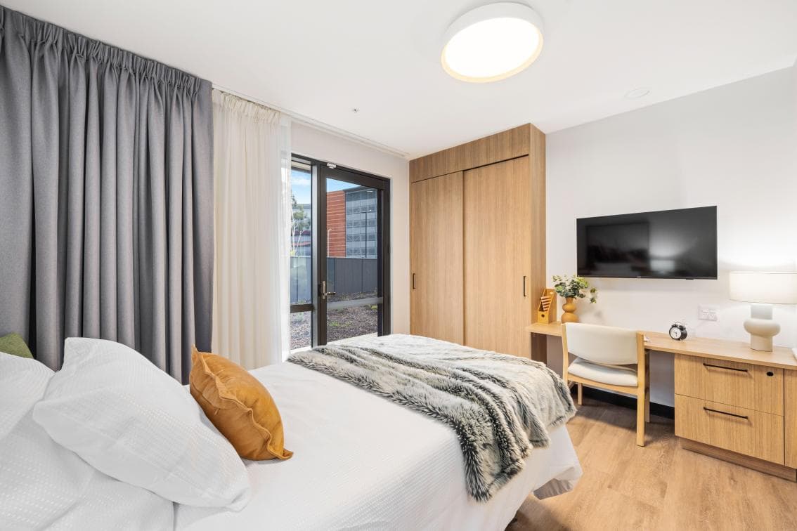Spacious bedrooms designed for your comfort. Each room includes a built-in wardrobe, desk, lounge chair and individual heating and cooling with personal climate controls. All rooms offer direct access to a courtyard or garden.