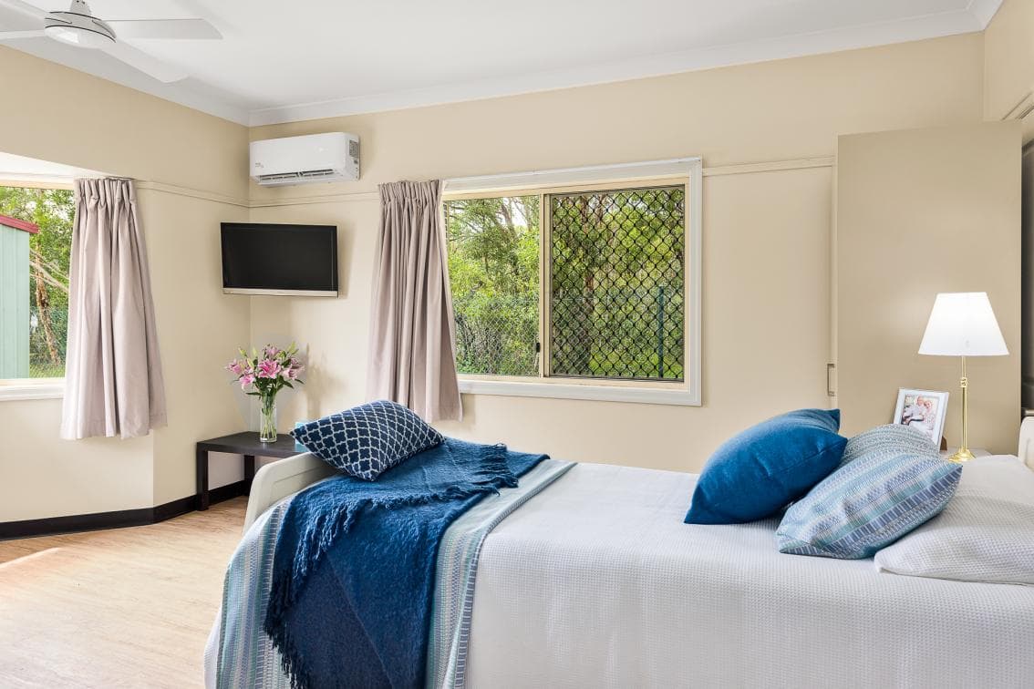 Comfortable, well appointed room with own large private ensuite. All rooms at Mt Coolum Aged Care are maintained to the highest standard with respect to paint, fixtures, fitting and fabric of the environment. All rooms are independently air-conditioned in addition to a ceiling fan. All rooms have a nurse call system, TV Bracket, telephone socket and can connect to Foxtel on request.