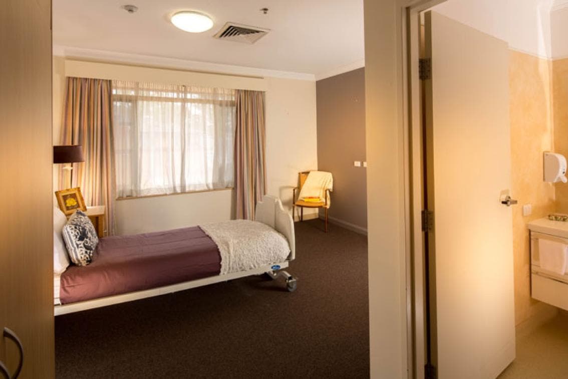 This private 9 sqm room features high quality furnishings including an adjustable bed, arm chair, an over-the-bed table and storage of a wardrobe and drawers. Quality soft furnishings include curtains and bedding. The room has access to a shared bathroom that consists of a toilet, wash basin, shower and mirror. Residential amenities include access to a registered nurse 24 hours a day and an easy-to-use nurse call system.
