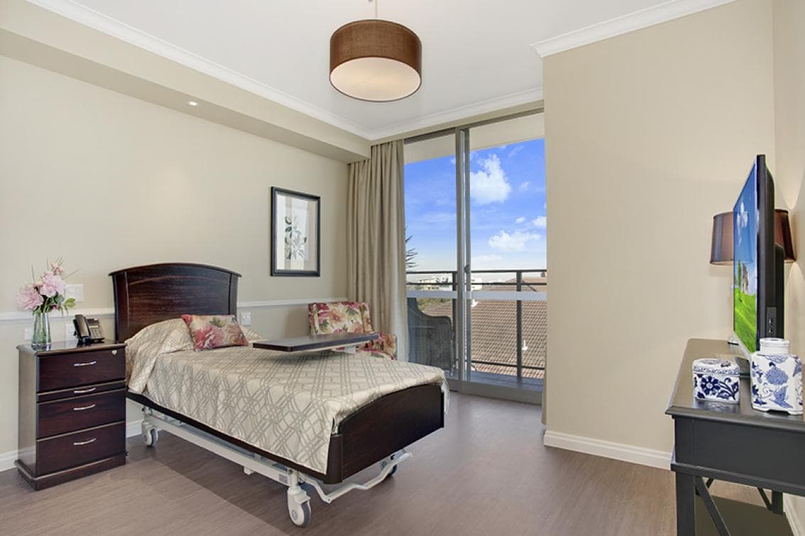 Opened in August 2014, our boutique aged care suites have been thoughtfully designed to maximise amenity for our residents, whether it be views, access to sunlight and natural ventilation, private balconies and additional internal room area and furniture items. The interior design, furniture, fittings and equipment have premium finishes with a warm and luxurious feel. Each suite is fully furnished and has designer-selected décor and fittings. We encourage residents to bring their own furniture, memorabilia and items to make their room space feel as homely and comfortable as possible. A photo wall and room gallery space has been allocated to each room to facilitate comfort and promote personalisation. The bedrooms are equipped with: electronic adjustable bed; arm chair; bedside table with lamp; locked personnel drawer; built-in wardrobe; nurse call button; flat screen TV; telephone connection and handset; wifi and Foxtel enabled; reverse-cycle air conditioning; premium sheer curtains with blackout fabric backing; doors are able to be locked for securityOur Balcony Superior suites have the largest floor area of our balcony rooms and flows onto a private balcony. Each room has a private ensuite bathroom which is generous in size (5m2) and are fitted with an individual vanity with personal built in lighting; heat lamps and anti-slip tiles and nurse call button.