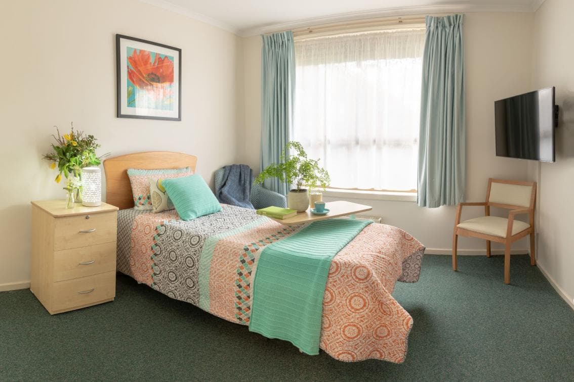 Private rooms at Estia Health Keysborough are generous and light-filled, with adjustable bed, generous built-in wardrobe with drawers, chest of drawers, ceiling fan, hydronic heating, call-bell, and television and telephone connections on request. Some rooms open towards the front garden, while others face out onto courtyards. Ensuites include open shower (with ample space for supportive equipment), exhaust fan with heat lighting and vanity.