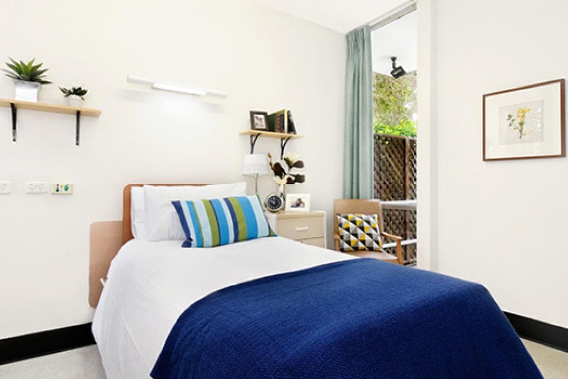 Spacious room with abundance of natural sunlight through large picture window, facing outward to the veranda. Large built in wardrobe, bedside locker, privacy screen, comfort high back chair. Shared bathroom.