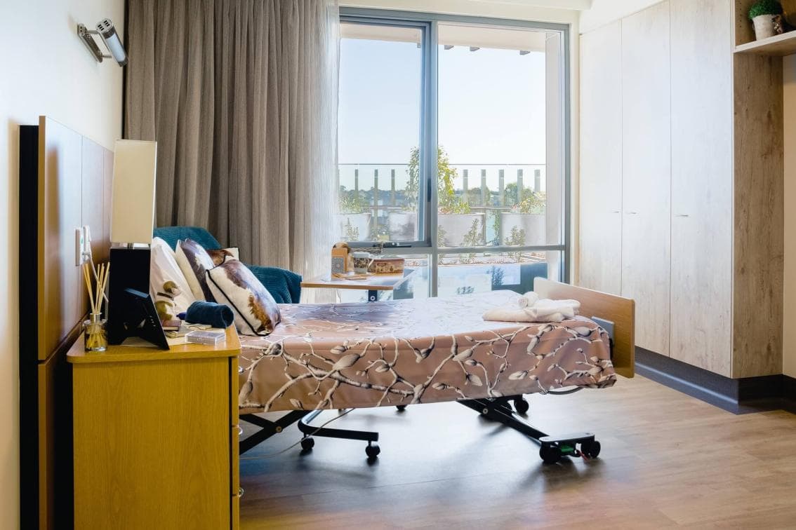 Modern single bedroom with private ensuite bathroom. The room is designed for comfort with appropriate personal storage and furniture that is designed for Aged Care needs.