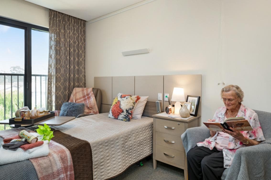 Modern single bedroom with private ensuite bathroom. Our rooms are designed for comfort with appropriate personal storage and furniture that is designed for aged care needs.