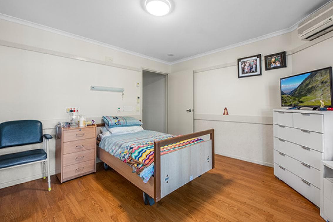 Large, private room with private ensuite with charming garden views. The room can also accommodate couples in comfort. Low maintenance living with built-in hotel services including laundry and meal services. Room includes a comfortable electric bed, bedside table, large flat screen television, lounge chair, coffee table, wardrobe with lockable drawers as well as split system air-conditioning.