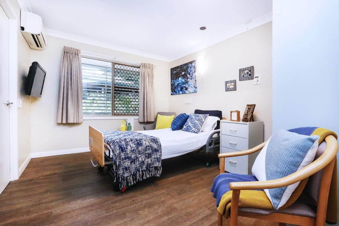 Single Rooms are spacious single rooms with ensuite and garden views. The rooms are furnished with an electric bed, cupboards, bedside table, chair, lockable cabinet and vinyl flooring. All rooms are air-conditioned and have natural light and windows with curtains, phone point, and a 24-hour nurse call system.