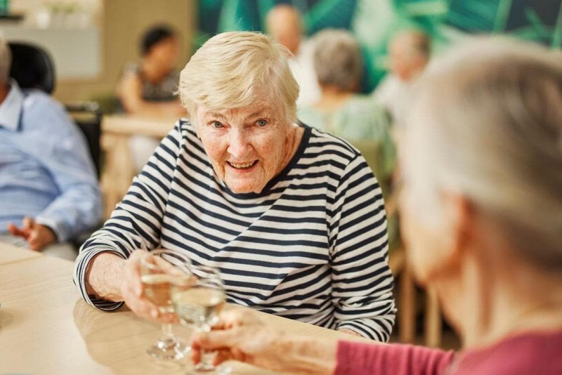 Large private suites with private ensuite bathroom One resident per room Single electric bed Bed coverings, sheets, pillows and bedspread Wall-mounted SMART TV Built-in cabinetry, wardrobe and cupboard with space for bar fridge Wood-like vinyl or carpet flooring Air conditioning Windows with curtains and screens Emergency call buttons Ensuite bathroom Vinyl flooring Wheelchair accessible with grip rails Vanity area with bench space and storage Emergency call button