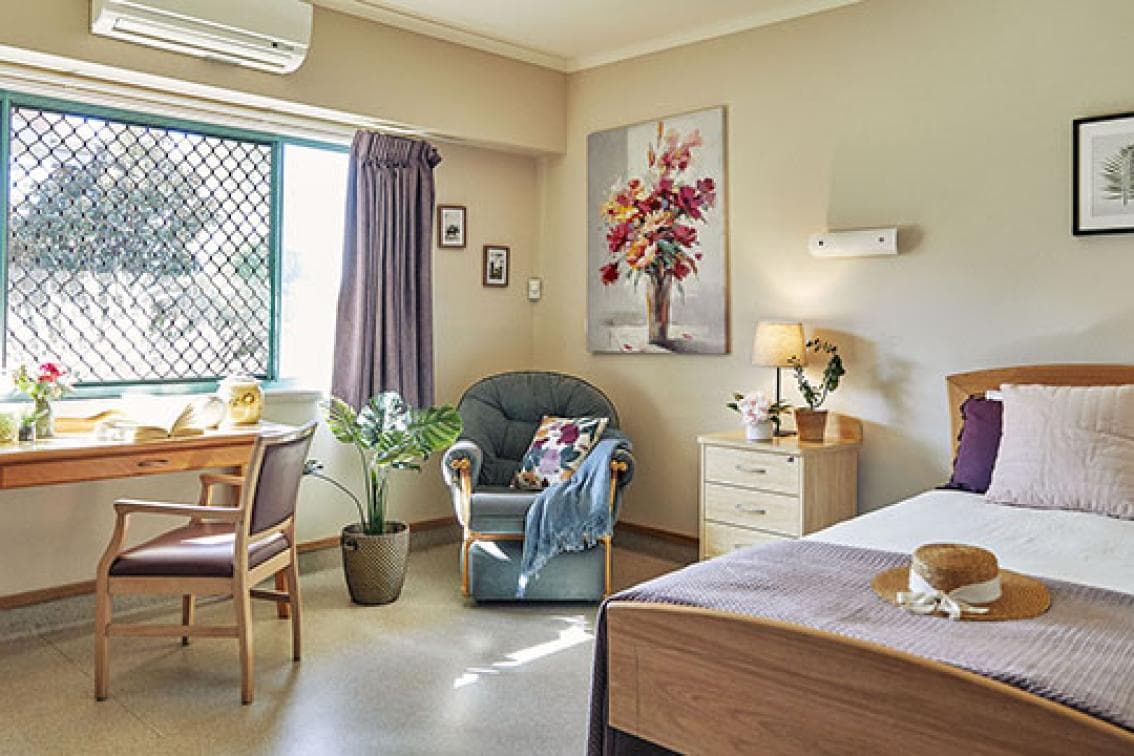 Our Comfort Living Room at Uniting Caroona Yamba has been designed for privacy. The room offers home comforts including a bed, bedside table, traditional furnishings and fittings, personal storage and a private ensuite. All of these rooms are in excellent condition and are well lit.