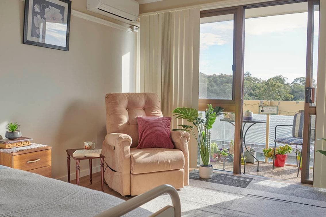 Our Comfort Living Room at Uniting Springwood has been designed for privacy. The room offers home comforts including a bed, bedside table, traditional furnishings and fittings, personal storage and a private ensuite. All of these rooms are in good condition and are well lit.