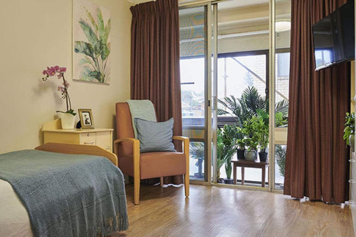 Our Comfort Living Room at Uniting Bruce Sharpe Rockdale has been designed for privacy. The room offers home comforts including a bed, bedside table, traditional furnishings and fittings, personal storage and a private ensuite. All of these rooms are in original condition and are well lit.