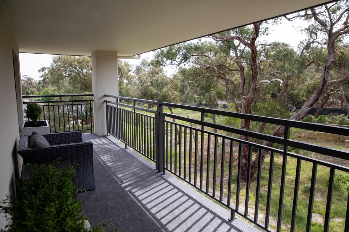 A delightful room with external access to either a patio or balcony. Included is a 50” wall-mounted Smart TV, additional under TV console, blinds and sheers, king single electric bed, private tiled ensuite and reverse cycle air-conditioning with individual temperature control.