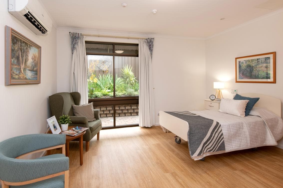 Key feature: • Private ensuite General inclusions: • Private ensuite consists of a toilet, shower, vanity basin and vanity cabinet • An electric adjustable high/low bed, bedside cabinet, bedside chair and overway table • A built-in wardrobe which includes a chest of drawers with a lockable drawer • Reverse-cycle heating and cooling with individual temperature control • Private phone connection available • A call button and access to 24 hour nursing care
