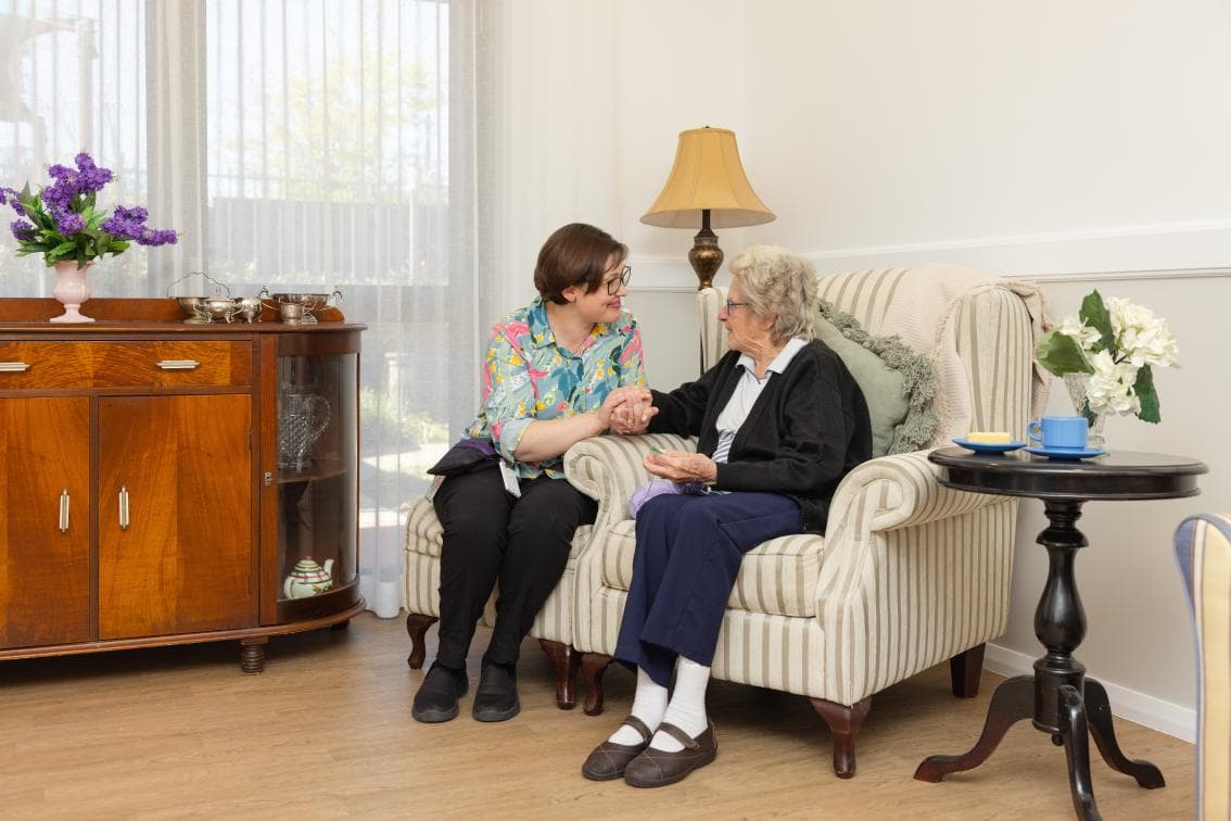 These newly refurbished private rooms feature built-in cabinetry, plenty of space for treasured belongings, VJ panelling, new flooring and room for a small fridge. Each air-conditioned room has either views of the countryside or opens out onto a courtyard, and comes with a TV, telephone connection and an emergency call system. Each room comes furnished with a bed, bedside table and armchair.