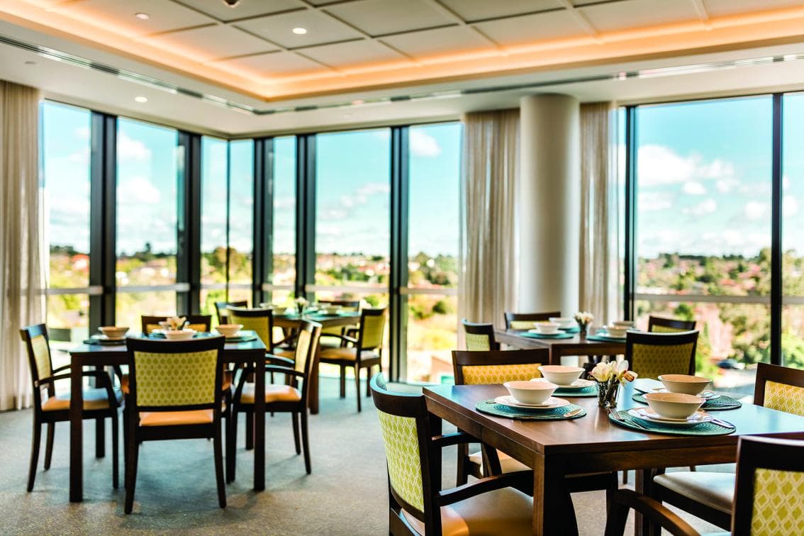 Our Eucalyptus rooms are of premium standard, with higher-quality room furnishings including electronic high/low adjustable beds, bedside tables and large built-in wardrobes. They also feature a larger flat-screen TV, individually controlled air-conditioning and hydronic heating. The ensuite bathrooms have been fitted with high-quality floorto-ceiling tiles and sensor monitoring to automatically alert staff in times of need. Rooms in this class are located in premium positions, either on the top floor or in winged clusters. This is designed to encourage smaller communities of residents to form closer relationships, while reducing noise and interruption to allow greater privacy and family engagement. These rooms have the special advantage of uninterrupted views above tree lines and the surrounding neighbourhood.