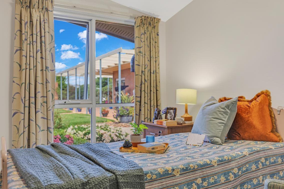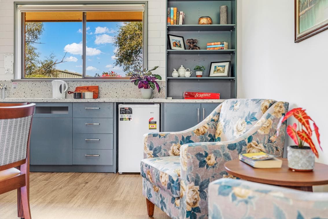 The Premium Suite offers 2 separate rooms, joined by an interconnecting ensuite. Residents can choose to set up one room as the bedroom and the second room as a separate lounge area. Koraleigh has been designed specifically to feature 3 designated areas, including a dedicated Memory Support Unit. The original rooms were constructed in 1993, with additional rooms added in 2016. The bedroom, furniture and fittings are in good condition. Bedrooms look out onto landscaped/garden areas. Rooms include: • electronic high low adjustable bed • built in double wardrobe • staff call points • landline telephone connection capability • Individual inverter reverse cycle air conditioner • large ensuite with vanity unit • handrails in the ensuite • windows are fitted with flyscreens. • bedroom floor is cushioned vinyl or carpet with non-slip vinyl in the ensuite • doorways are wide for ease of mobility