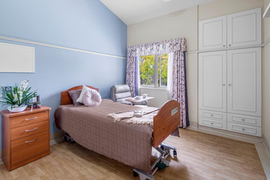 Rooms are large and have views of garden or courtyard areas. Each room is well maintained and contains a high low bed, bedside tables, tray table, built in wardrobe, a bedside chair, flat screen television and an individual air-conditioning unit. The windows have curtains and the floor covering is vinyl.' A telephone connection is available in each room and call bell access is available in each room and ensuite.
